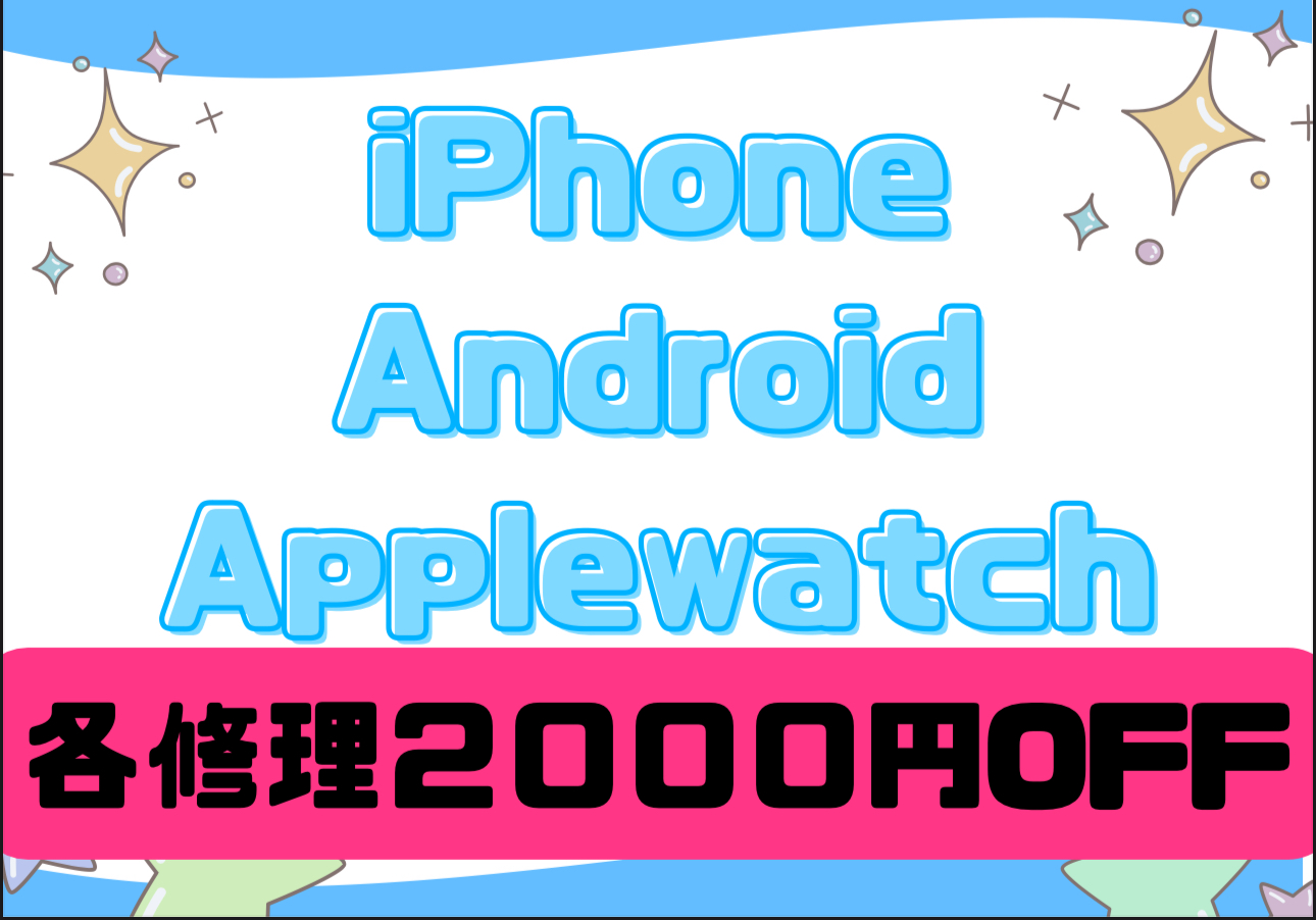大阪府でiPhone修理ならスマートクール エトレとよなか店・ららぽーとEXPOCITY店へ エトレとよなか店/ららぽーとEXPOCITY店 エトレとよなか店 06-6836-9168 10:00〜21:00 第3水曜日定休 ららぽーとEXPOCITY店 06-6170-6199 〈平日〉10:00〜20:00 〈土日祝〉10:00〜21:00 メニュー 電話 ネット予約 ホーム 修理一覧 修理の流れ FAQ 店舗概要 コラム お問い合わせ エトレとよなか店 ららぽーとEXPOCITY店 エトレとよなか店 ららぽーとEXPOCITY店 ホーム 修理一覧 修理の流れ FAQ 店舗概要 コラム お問い合わせ 実績リアルタイム速報 ホーム > 最新のお知らせ > キャンペーン > 期間限定!修理割引キャンペーン! 期間限定!修理割引キャンペーン! キャンペーン iPhone、Android、Applewatch修理が 2000円オフになるキャンペーンを開催いたします!! 修理料金が安くなるこの機会にぜひ当店をご利用ください!! 対象店舗: エトレとよなか店 ららぽーとEXPOCITY店 対象期間: 10月14日~10月31日 ※予約割引、各種クーポンとの併用は不可です。 ※基板修理等、一部対象外の修理があります。その際は受付時にご案内させていただきます。 ※複数箇所の修理の場合、各箇所2000円割引になります。お得ですのでぜひご利用ください。